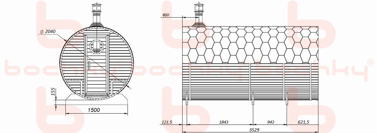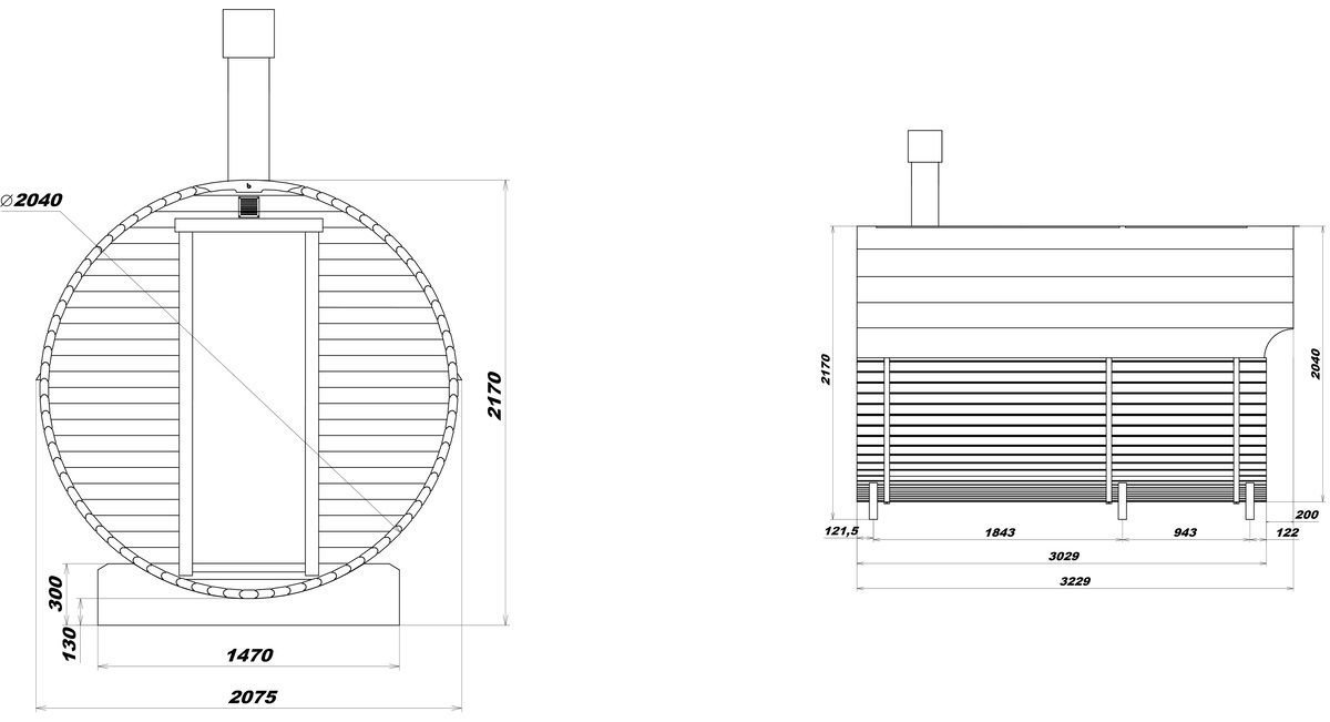 КАРКАС Еловый или кедровый профиль толщиной 42х92 мм, влажностью 10% Козырек или крыльцо 600 мм перед входной дверью Основание под баню (деревянные ножки) Обручи из нержавеющей стали с замками Внешняя обработка антисептиком в один слой (при поставке изделия в готовом виде или со сборкой на участке)